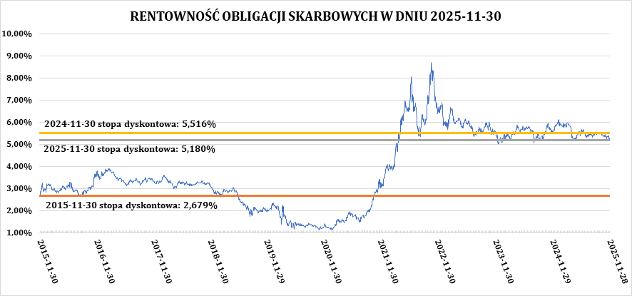 W dniu 30.11.2025 roku rentowność obligacji ukształtowała się na poziomie ok. 5,180%